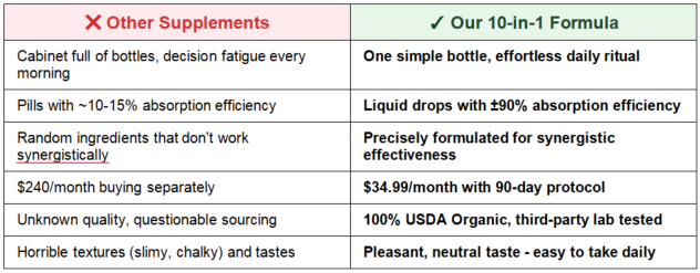This isn't just convenient - it's essential. Your symphony of symptoms (fatigue, brain fog, anxiety, inflammation, digestive issues) isn't caused by a single deficiency. It's systemic breakdown that requires comprehensive, synergistic support.